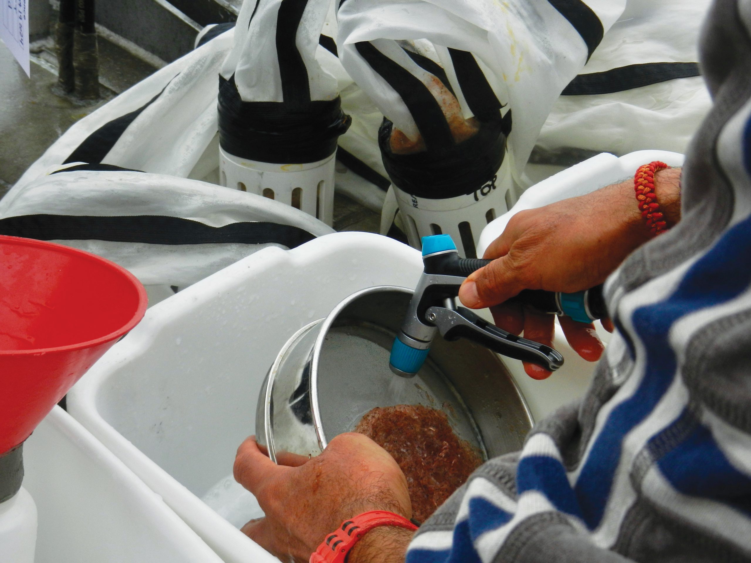 The researchers began to gather around Jahncke as he poured the net’s contents through a sieve, revealing a gelatinous pink mass. It was krill from the depths, which he and the team rinsed and placed into specific sample tubes to observe later on land.