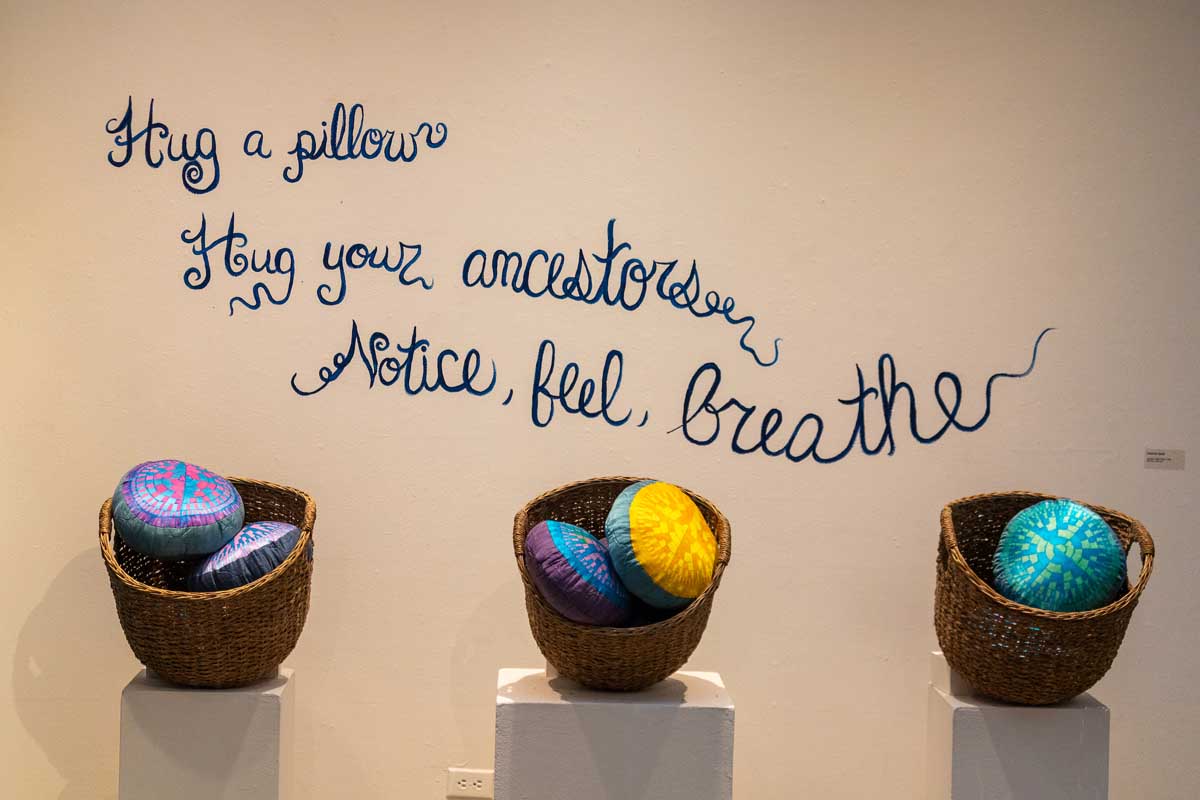 Three woven baskets hold round pillows, each painted with a bright sun-like geometric design. On the wall behind them, scrawled in curly cursive, is the message, “Hug a pillow/ Hug your ancestors/Notice, feel, breathe.”