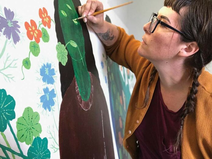 Sonoma County artists selected by Robinson and a jury painted 10 murals, which feature a range of styles and techniques, from the graffiti-inspired art of Ricky Watts and Rhett Johnson, to the whimsically nature-influenced paintings by Angela Hunter Geiss and Mica Jennings (pictured). Local educational nonprofit group ArtStart even got in on the murals and contributed one created by several local summer art