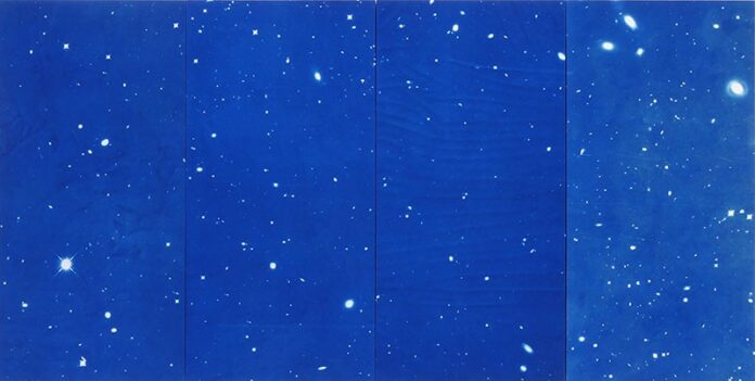 “Be Not Still” features four installations, including Iranian-American artist Ala Ebtekar’s Azimuth (shown), which transfers an image of the cosmos taken by the Hubble telescope onto ceramic floor tiles and explores what it means to live without borders. Other works include Allison Smith’s investigation of the rise of white nationalism through cast-iron tiki torches, and Rigo 23’s three-dimensional model of the American flag as a series of walls that viewers can walk through.