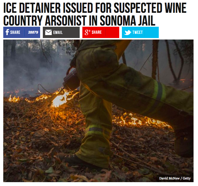 The Breitbart article links to a Press Democrat report on the arrest, which took place on the afternoon of Sunday, Oct. 8, hours before numerous wind-blown infernos forced people from their homes throughout the region.