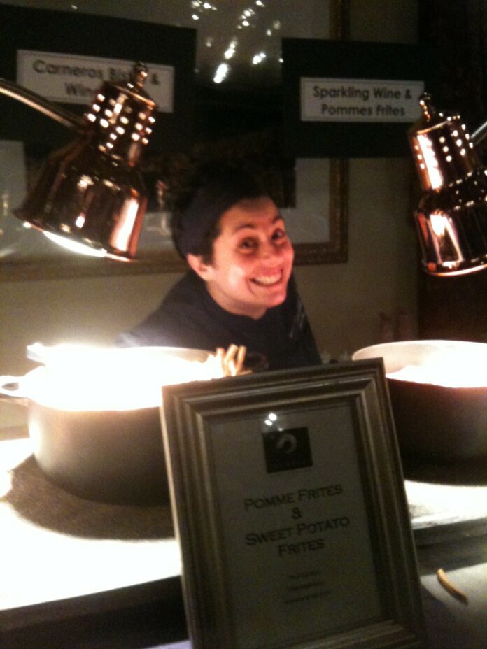 The best way to enjoy these kinds of events is with a friend, be they a spouse, lover, blind date or, as I did, with a girlfriend. Drifting from table to table, waiting patiently if your companion can’t have the cheese at that table but can definitely have the beef at that one, Vinolivo featured a live jazz soundtrack, plenty of people-watching, great homemade fries courtesy of Carneros chef Janine Falvo (above), plenty of good sparkling wine to match the frites and an easy way to swan around eating small bites while drinking great wines and chatting.