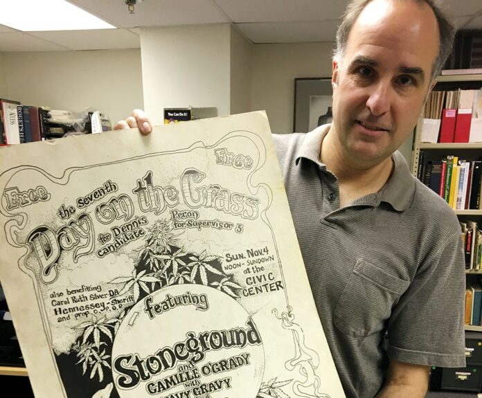 Still, members of the community have come forward, offered their expertise and shared hundreds of posters, flyers and photos, some of which will be displayed. Vince Dugar, an amateur archivist from Petaluma, offered his cannabis collection of memorabilia. Joe Rogoway’s Santa Rosa law office made a cannabis timetable for the exhibit and Sarah Schrader from Americans for Safe Access handed over a box of her old photos.
