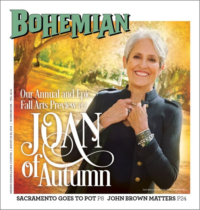Joan Baez, who graces our cover this week, is touring this year on what she’s calling the Fare Thee Well Tour, but we editorial scribes at the Bohemian sure hope the legendary folk musician and heroine of ’60s counterculture doesn’t retire just yet—well, at least not until she’s taken a righteous spin through our annual and epic fall arts preview produced by stalwart arts editor Charlie Swanson! Joan blows through the North Bay for a show at the Green Music Center in November—which reminds us to highlight our gratitude for autumn in the North Bay.