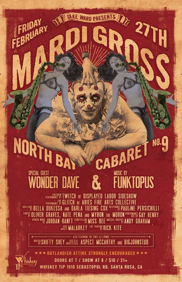 Think the wildest, craziest Mardi Gras party of 2015 is behind you? Think again. On Friday, the North Bay Cabaret returns for its monthly revelry, and this time they’re putting on their own kind of Mardi Gras, with the funkiest lineup yet. Headlining the night is special guest Wonder Dave, from Oakland’s outlandish variety show Tourettes Without Regrets. Also hitting the stage will be the addictive beats of Funktopus and DJ Malarkey. If that’s not enough, there will be sideshow and fire performances, belly dancing and burlesque, spoken word, comedy and more in a night of extravagant fun. Let it all hang out when you hit North Bay Cabaret’s Mardi Gross on Friday, Feb. 27, at Whiskey Tip, 1910 Sebastopol Road, Santa Rosa. 7pm. $10. 707.843.5535.