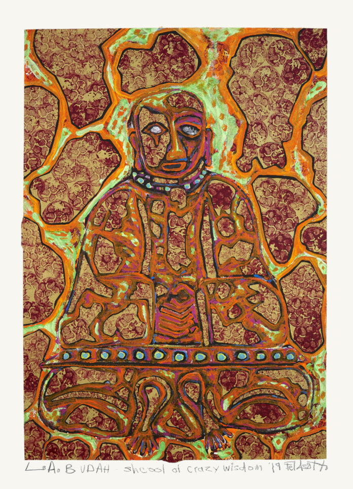 Fast forward to 2022, and Feldsott’s show at Paul Mahder Gallery, featuring a body of work called “The BuDah Paintings.” In his signature blocky, thick-brush style, Feldsott has produced myriad different paintings, all depicting the Buddha. He explained the reason behind his study to me.