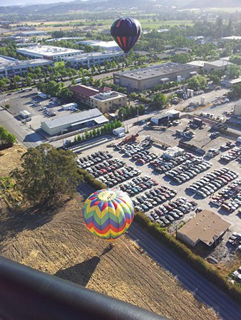 So we take off from Keiser Park around 7am, soaring majestically over the Sonoma County Airport, the Windsor Golf Club and hundreds of acres of vineyards. Past the paved roads and cul-de-sacs is where the true beauty of Sonoma County comes to life: we’re surrounded by mountain ranges, vineyards and oak trees enveloped in a clear blue sky. A trace of wind pushes us south, and with eyes closed, it’s impossible to tell we are even moving.