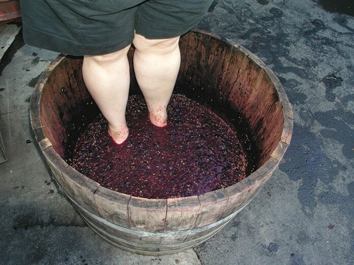 And when they step on it barefoot, says Schultz, “we know what that fruit feels like pretty intimately.” Their feet relay information that may be helpful to winemaking, like temperature and condition of the grapes and stems. “It tells you a lot without really doing anything—you’re just relying on your senses.”