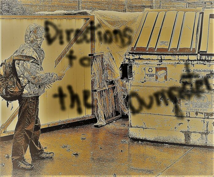Directions to the Dumpster is a phrase Campagnola uses literally and figuratively, arguing that in a capitalist society, the homeless are seen as worthless in so much as they are often given directions to the dumpster when they do reach out and ask for help.
