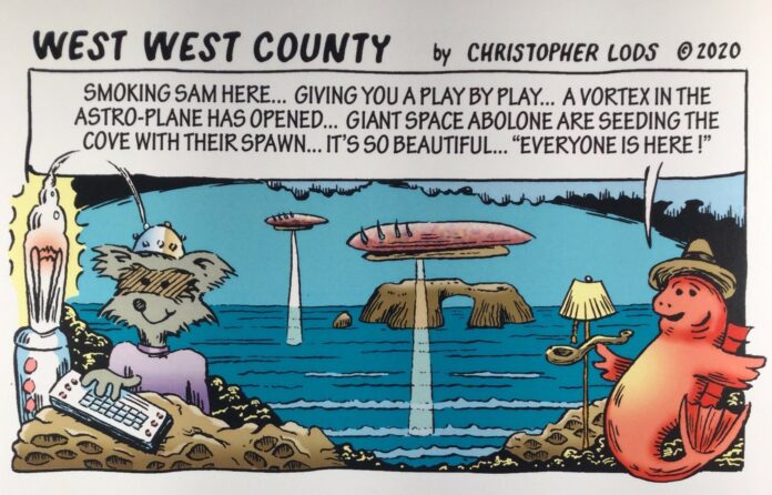Now, Lods is using West Sonoma County as the backdrop for his new comic strip, “West West County,” featuring a locally-inspired cast of characters engaging in fantastic adventures that touch upon several local references.