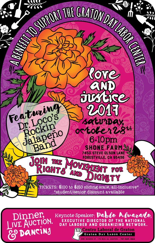 items and enter a raffle, will be discounted for students and CLG workers. Proceeds will fund the center’s outreach and organizing efforts, including labor-rights education for domestic workers, who often have restricted access to information and support. Love and Justice 2017 at the Shone Farm Pavilion, 7450 Steve Olson Lane, Forestville. Saturday, Oct. 28, 6–10pm. Tickets, $100–$150, or donate a ticket to a low-income community member for $95.