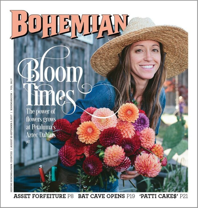 A few years back, Freestone resident Kate Rowe spotted a lone potted dahlia plant for sale at the Friday night Occidental Farmers Market. The plant had just one ball-shaped bloom, yellow in the center, with raspberry-colored petals. A stranger to dahlias, Rowe describes being “completely smitten” upon seeing it, and then laughs, recalling that she had also met her longtime partner, Omar Duran, at the same market.