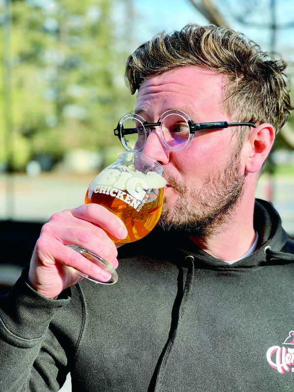Kelly and his crew began working on the recipe for 2023’s Big Chicken brew in November, at which time they began hashing everything out with their growers and suppliers. The first batches began brewing on Jan. 11, about four weeks ago, in order to make a higher alcohol content beer that is allowed to ferment slightly longer, thus making a deceptively drinkable 10% alcohol content beer. This year’s batch is, according to Kelly, more of a West Coast IPA-style beer, meaning the yeast is less hazy and a little more neutral tasting in order to bring out the fruitier flavor profile.