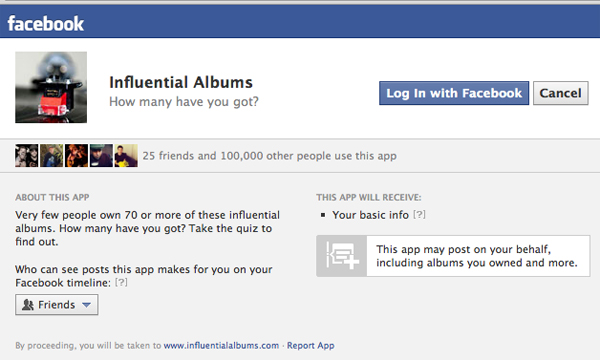 Facebook has been abuzz in the last few days with this moronic “Influential Albums” quiz, which users must hand over their personal information in order to take, and then watch as the app automatically posts the results on their wall. Strike one. Also, the 100 albums deemed “influential” are nearly all rock. Strike two. Finally, the mere existence of a list purporting to encompass the 100 most “influential” albums with the implication that if you don’t own these albums you are a substandard music listener is total bullshit and everyone knows it and I feel stupid even getting worked up about it because that’s what these trolling lists are designed to do in the first place but fuck it. Strike three. You know what your most influential albums are? ALL THE ALBUMS YOU OWN, HOLMES. (That’s coming from someone who owns a lot of these albums.)