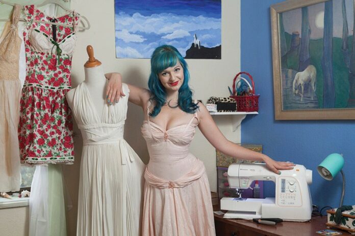 “I borrowed my grandma’s vintage dresses,” she says in a coy and soft-spoken voice, like a character from season three of Mad Men, “and then started hand-sewing dresses and wearing them to school. My parents bought me a sewing machine at some point, and my grandma taught me needlepoint.”