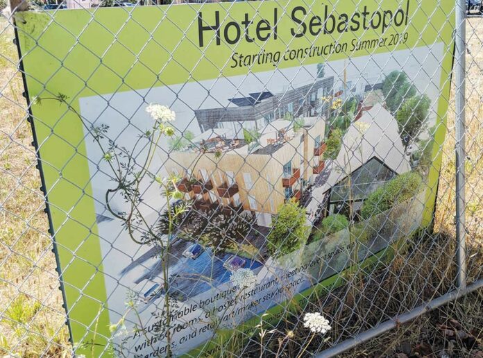 The sign says one thing, but the facts say another—and raise a question: Will construction on the much-anticipated Hotel Sebastopol ever begin?
