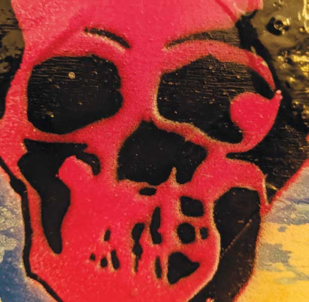 At a recent exhibit of the artist’s work and collaborations at Petaluma’s Sonoma Coast Surf Shop, Sewell showcased his knitted, wearable digital pixelation garments for “When you want to fake that nude but not regret it later … cover your bits with BITS.” Sewell’s tableaux also included a piece of “found art” originally created by fellow artist Johnny Hirschmugl (otherwise branded as Art by Johnny), which Hirschmugl himself offhandedly said Sewell hoped would be stolen at the event. I obliged. I offer my confession here, publicly, to attest to having aided in closing (what I hope was) the conceptual loop as well as heading off any legal pursuits in the matter since stealing the painting was technically performance art. The piece is now on my bookshelf. If either artist wants it back, you know where to find me (on eBay).