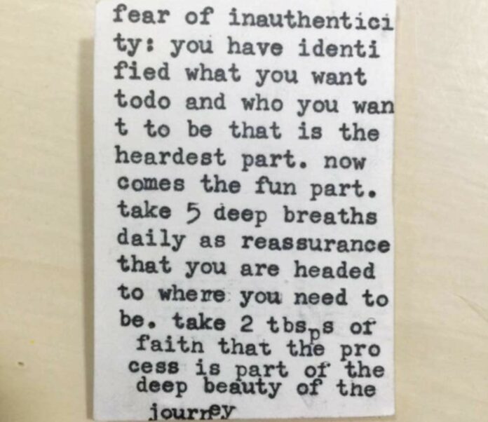 “Fear of inauthenticity: You have identified what you want to do and who you want to be, that is the hardest part. Now comes the fun part. Take five deep breaths daily as reassurance that you are headed to where you need to be. Take two tablespoons of faith that the process is part of the deep beauty of the journey.”