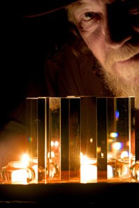 Jim Standard, hunkered down on the floor of his compact Sebastopol cottage with his back propped up against a piece furniture, is gazing across the room into the multisided reflection of a Spectral Generator.