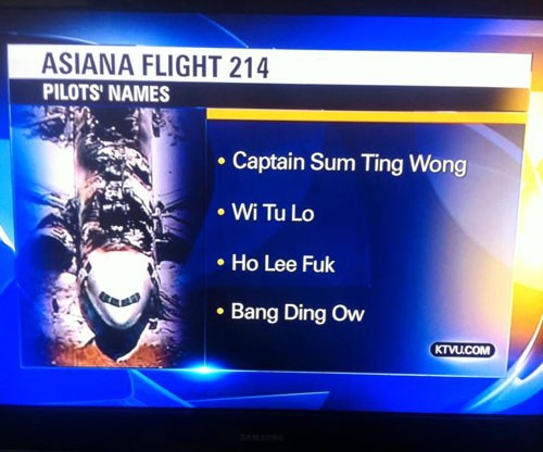 Today, KTVU News announced the names of the pilots on Asiana Flight 214, provided to them, apparently, by a 12 year-old boy, and vetted by nobody.