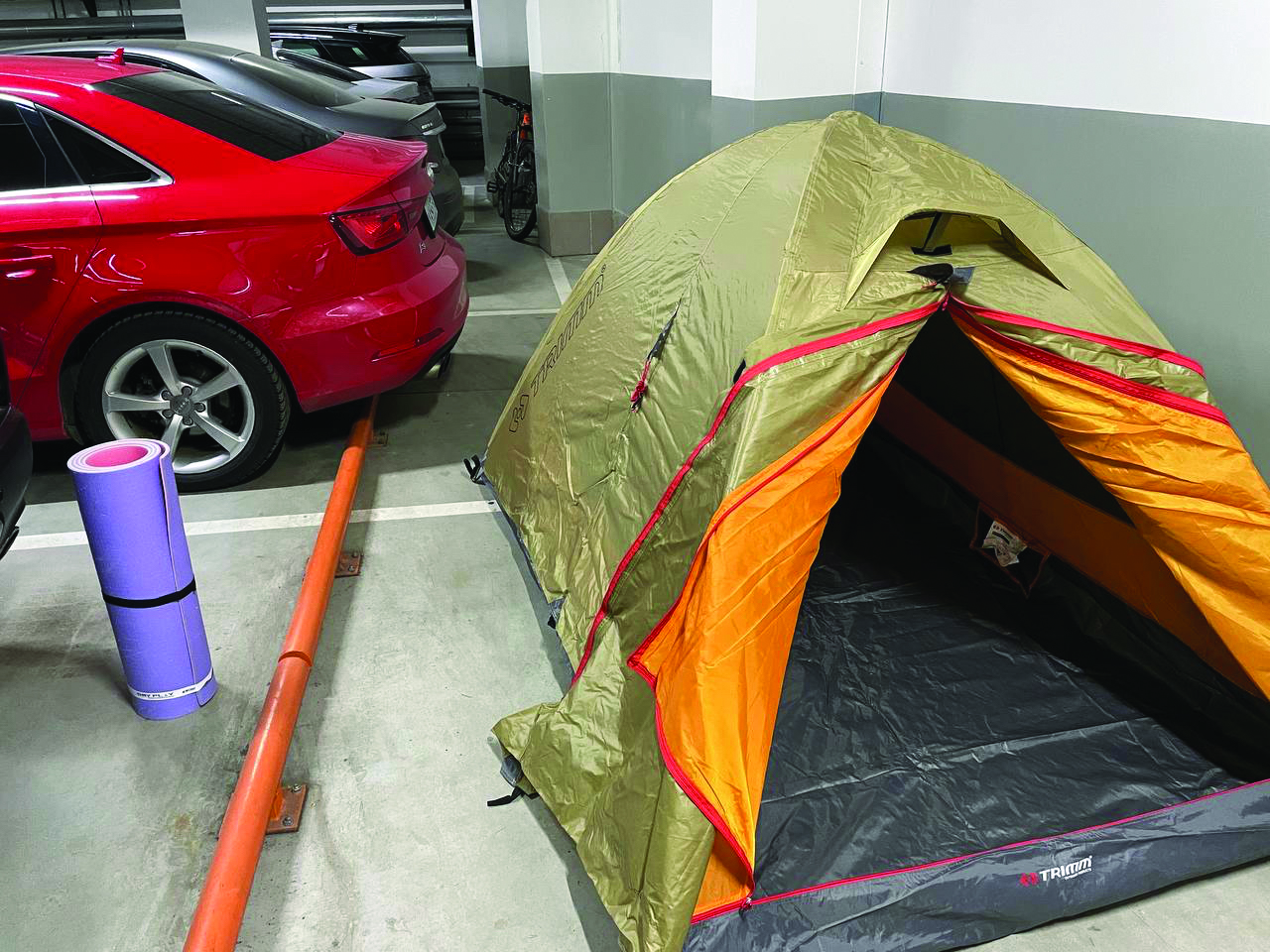 She sent me a photo of a two-person tent on the concrete floor of a brightly lit parking garage. “This is our sleeping arrangement for tonight,” she wrote. I sent a photo of a California beach. “Beautiful!” she replied. Then she teased me about how cold it is in San Francisco, because I had told her earlier that people here start complaining when it hits 50 degrees. I checked the temperature in Kyiv that night: 35 degrees.