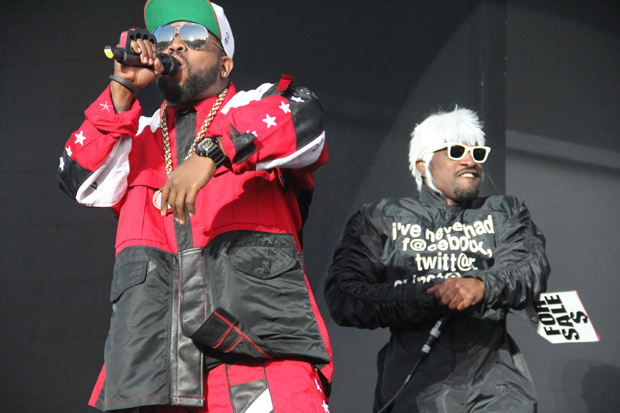 My friend Schell and I packed in close in anticipation of Outkast, making it into the front 10 percent of the crowd before they started a few minutes late. The Atlanta hip-hip duo of Andre 3000 and Big Boi was unveiled in a steel cage cloaked in black mesh, the familiar beat of “Bombs Over Baghdad” vibrating my skull in time with the bass hits. Subwoofers dominated all sound for the first three songs, but it settled down after that (or my ears built up a natural defense by then), and the diverse crowd really started kicking up dust with their dance moves. That’s when things got interesting.