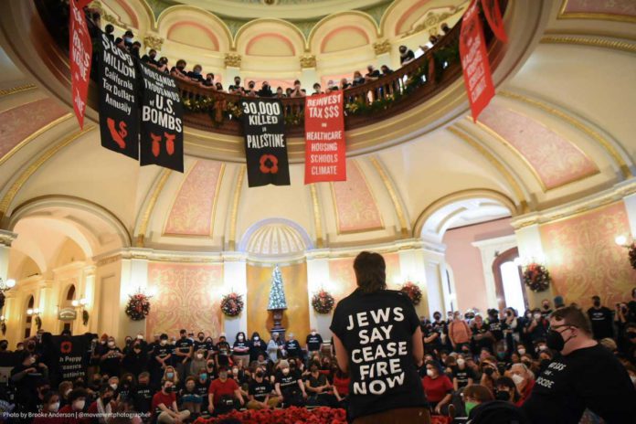 During the protest, called by Jewish Voice for Peace and the International Jewish Anti-Zionist Network, the group gathered in both the Assembly session and in the Capitol rotunda, singing Jewish songs and prayers, calling for ceasefire and dropping banners from the balcony of the Assembly room that said, “Jews say no to US funding of Israel’s genocide of Palestinians.”