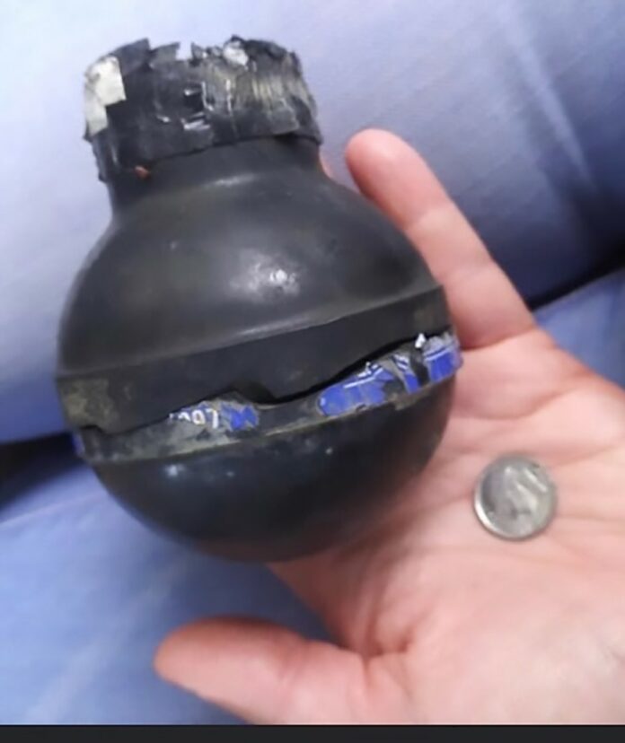 The crowd-control weapon used is known as a sting-ball grenade, a black ball somewhat larger than a tennis ball. When it detonates, it disperses dozens of smaller rubber balls at high velocity.