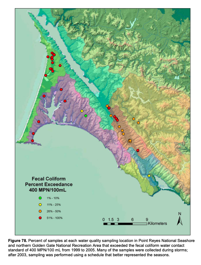 That report identified unacceptable levels of fecal bacteria in waters draining from McClure Ranch, abutting Abbotts Lagoon, and Kehoe Ranch at Kehoe Lagoon. It identified abnormal levels of fecal bacteria at Chicken Ranch Beach on Tomales Bay, which is a popular swimming destination. Park waters also suffer from excessive levels of nitrogen due to the flow of cow excrement. Nitrogen fuels vegetative growth that chokes drainages and kills fish and frogs, harming birds that eat aqua life.