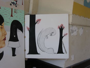Rojas, who appears almost shockingly youthful in person and who refused to give her age when asked, works the narrative landscape of the fairy tale in her small canvases. Using the multidisciplines of visual art, film, and music, she plans to create song cycles to accompany her flat paintings with their Russian-doll-like female characters–angry-faced, potato-bodied brunettes often sitting on beds or toting ladders–and to present a cinematic accompaniment. In the meantime, she’s run up a nice set of curtains for the front windows.