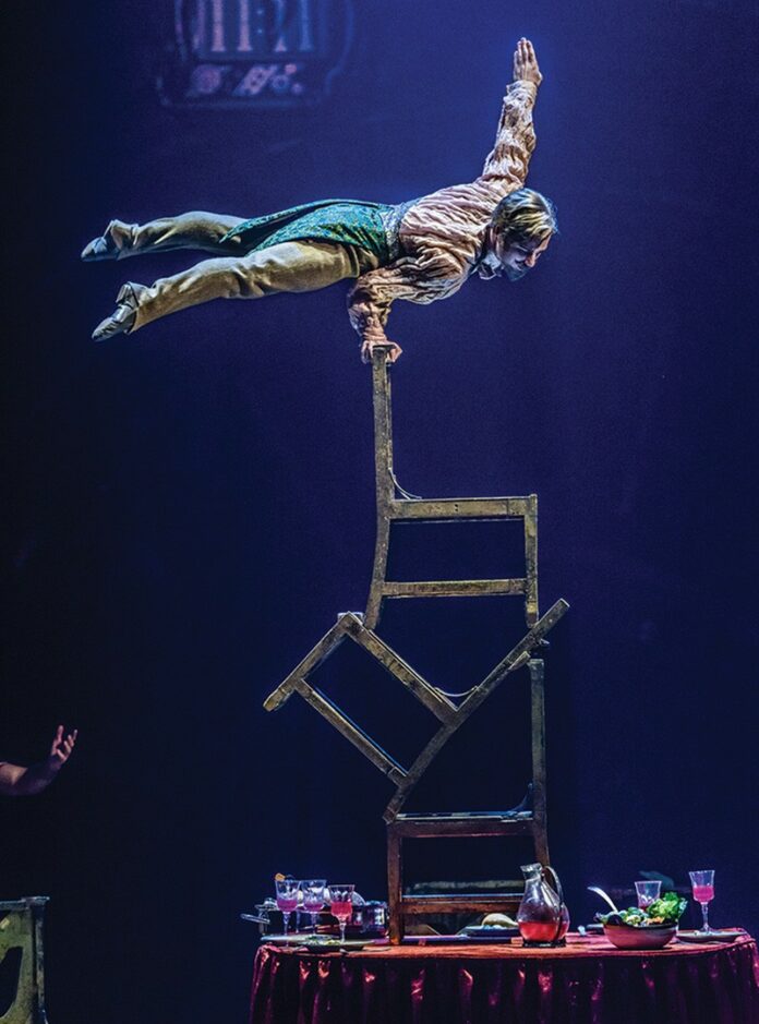 Most spectacular and dreamlike of all is an astonishing tea-party sequence, in which one of the guests (acrobat Andrii Bondarenko) begins to stack chairs higher and higher on top of the table, suddenly aware that an identical copy of the tea party, from table to guests to chair stacker, is hanging suspended (and upside down) from the top of the tent. As Bondarenko builds and climbs his tower, his double somehow “builds” his own “stack” of chairs, in a breathtaking and beautiful piece of circus theater.