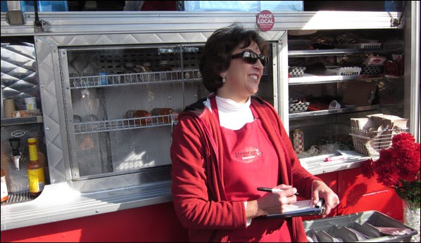 Established as Santa Rosa’s meager answer to downtown Portland’s famous blocks-long street food carts, Munch Mondays so far is just a handful of trucks. That’s bound to change. The crowd today wasn’t just a bunch of food bloggers and culture vultures—it was made up of businesspeople on a lunch break, downtown residents and merchants out for a quick bite. In other words, exactly the people Munch Mondays had hoped to attract. “I just feel bad that we’re out of so many things,” quipped Jilly Dorman (above), co-owner of the Street-Eatz truck and unofficial spokesperson for food cart owners.I couldn’t stay long, so I just grabbed a quick burrito from La Texanita, which had the shortest lines. (Dim Sum Charlie’s and Fork seemed to be slammed, and the Chicago Hot Dog guy who usually sells in Anarchy Alley next to Ting Hao was doing brisk business too.) But in the short time I was there, I did run into Bob Coburn, of the original Bob’s Fruit Truck. After selling food and wrangling with the law (and with the perception of competition from Petrini’s Market) for 25 years on Highway 12, a case could be made that Bob was the original street food purveyor in Santa Rosa.But that’s not true, actually, and brings to mind an important story.In his old age, while working as a low-paid janitor at the courthouse, Santa Rosa’s native son Julio Carrillo—who essentially founded this city with his philanthropic gifts of land—sold tamales for a time on Fourth Street in Courthouse Square to make ends meet. Historically, that would make Julio Carrillo the original street food purveyor on Santa Rosa. No wonder we love street food so much! It’s in our blood, people.A little more info. on Munch Mondays is here. Be there each Monday, from 11:30am-2:00pm, in what we still charmingly refer to as the “White House Parking Lot,” even though the White House department store hasn’t been there for over 30 years but damn if I don’t remember watching cartoons in a little coin-op booth while my mom shopped there when I was 5. Bring an appetite, ’cause this burrito I just finished at my desk was outstanding.