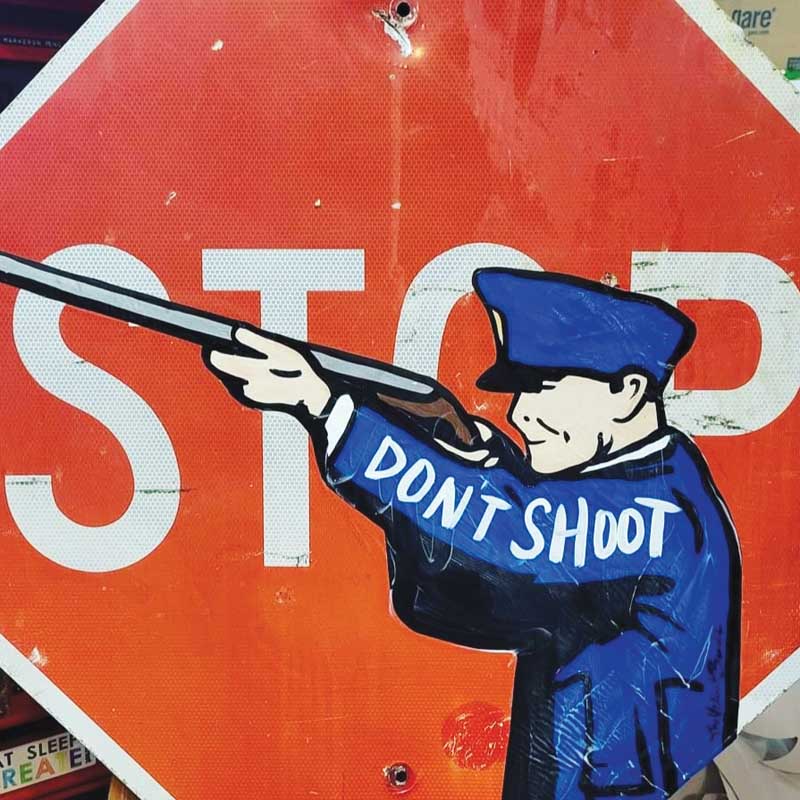 STOP A piece, ‘Stop Don’t Shoot,’ by the Velvet Bandit, is affixed to a local traffic sign.