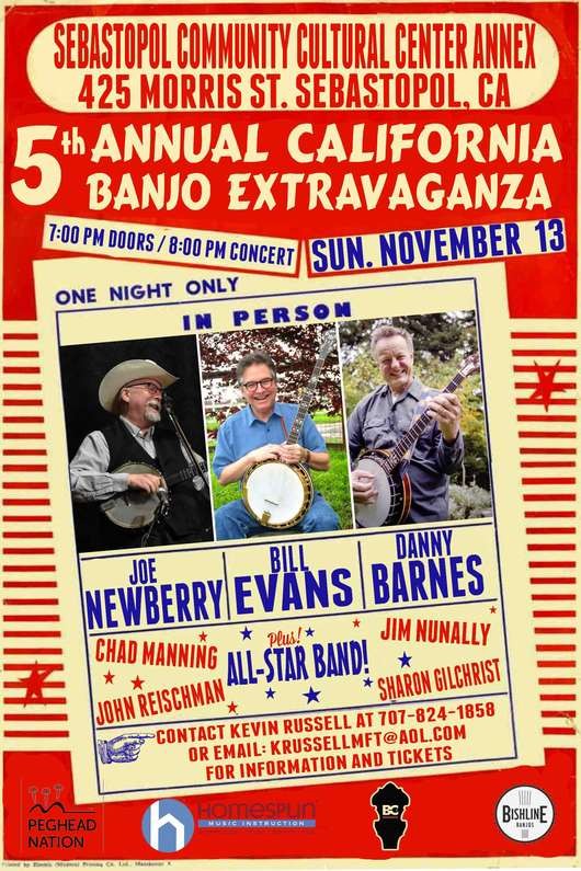 Old-time music masters gather again for the fifth annual California Banjo Extravaganza. This year’s headliners include Danny Barnes, Joe Newberry and Bill Evans. Barnes has played with the likes of Robert Earl Keen and won last year’s Steve Martin Prize for Excellence in Banjo & Bluegrass. Newberry is a frequent guest on A Prairie Home Companion, and Evans is the author of Banjo for Dummies. The all-star bluegrass-centric event also features mandolinist John Reischman, fiddler Chad Manning, bassist Sharon Gilchrist and guitarist Jim Nunally on Sunday, Nov. 13, at the Sebastopol Community Center, 390 Morris St., Sebastopol. 8pm. $22–$25. 707.823.1511.