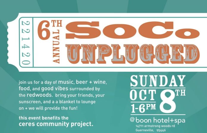Under the canopy of the Armstrong Redwoods, the boutique Russian River destination Boon Hotel & Spa presents a laidback offering of acoustic jams at the sixth annual SoCo Unplugged music festival. Benefiting the Ceres Community Project, which delivers nourishing meals to the ill, the unplugged afternoon includes acoustic performances by Sonoma County musicians Dgiin, Heather Combs, the Easy Leaves and Tumbleweed Soul. Wine and beer partners pour their best, and food from local purveyors like Seaside Metal Oyster Bar and Chile Pies Baking Company feeds the soul on Sunday, Oct. 8, at Boon Hotel, 14711 Armstrong Woods Road, Guerneville. 1pm to 6pm. General admission, $25–$40; 21-and-over ticket, $45–$60. 877.869.2721.