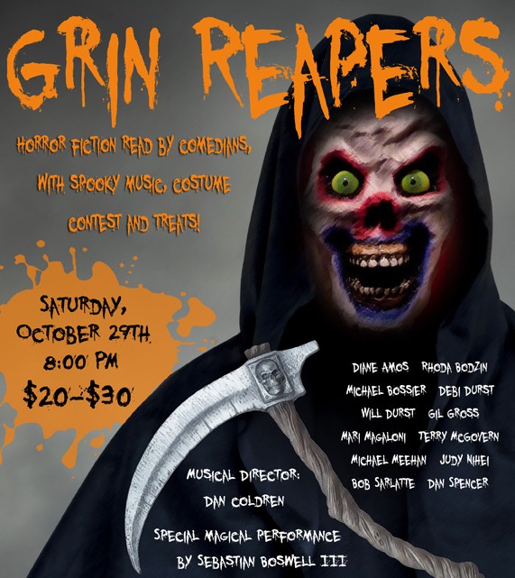 Have you ever been so scared that you laughed? If so, the upcoming Grin Reapers extravaganza is for you. Featuring a strong lineup of standup comedians, a costume contest and Halloween-themed musical numbers, this special event boasts spooky stories and songs that will chill and delight. Gasp as comedians read their favorite tales of terror from masters of the macabre like Stephen King and Edgar Allen Poe! Shriek as award-winning mentalist Sebastian Boswell III performs amazing feats of magic! Laugh your head off as Diane Amos, Will Durst, Gil Gross, Terry McGovern and many others perform on Saturday, Oct. 29, at Throckmorton Theatre, 142 Throckmorton Ave., Mill Valley! 8pm. $20–$30. 415.383.9600.