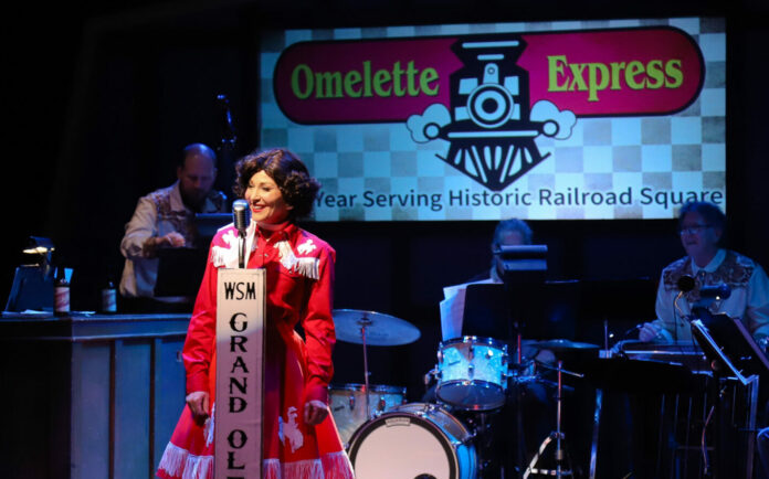 What detracts from that sense is the introduction of on-stage advertising to the playhouse. It’s tough to mentally transport oneself to the Grand Ole Opry in 1961 when a slide show featuring local restaurants and businesses is prominently displayed behind the band. The shout-out to a local country radio station from Louise didn’t help either.