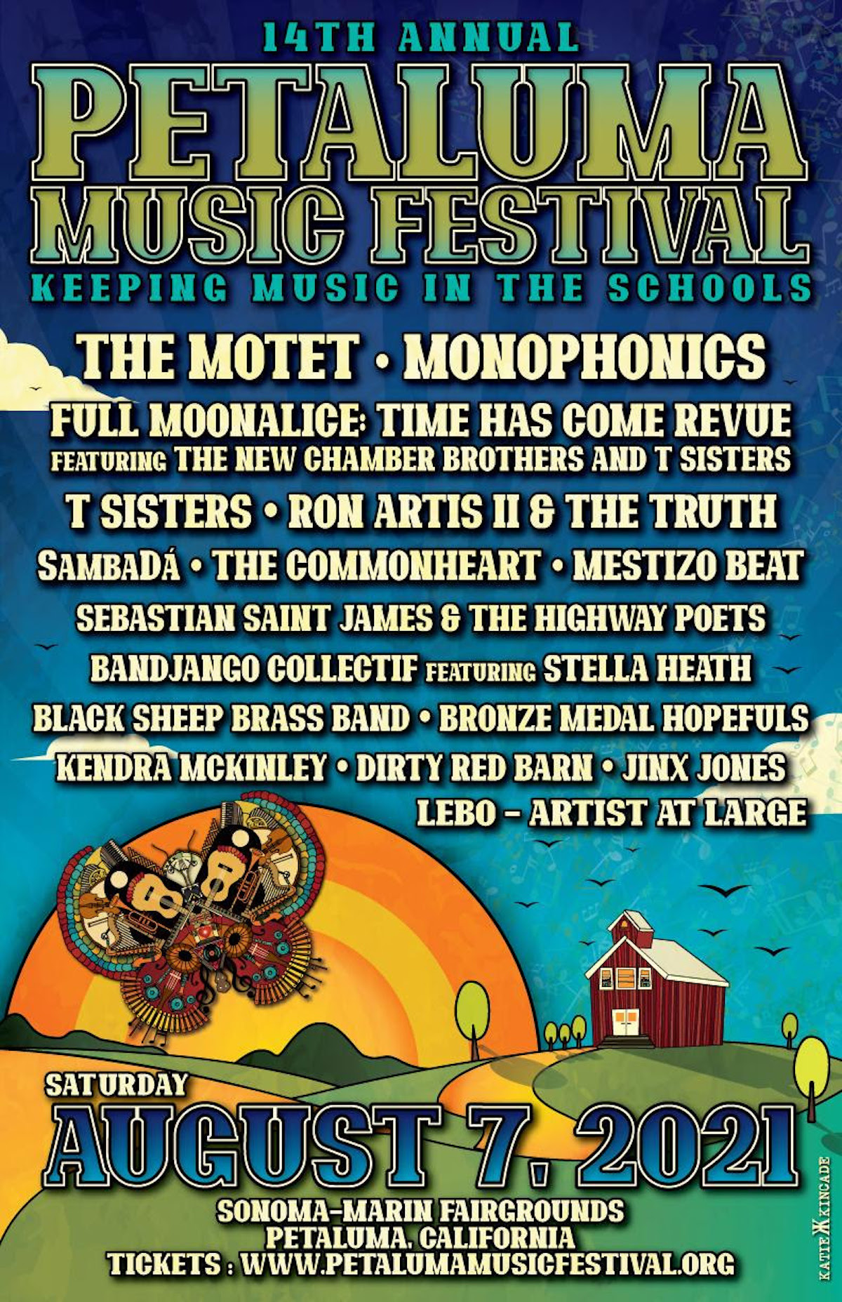 The full lineup for the 2021 Petaluma Music Festival includes the Motet, Monophonics, Full Moonalice: THC Revue featuring the New Chamber Brothers and T Sisters, Ron Artis II & The Truth, Lebo–Artist at Large (aka Dan Lebowitz), SambaDá, the Commonheart, Mestizo Beat, Sebastian Saint James and the Highway Poets, Bandjango Collectif featuring Stella Heath, Black Sheep Brass Band, Kendra McKinley, Bronze Medal Hopefuls, Dirty Red Barn and Jinx Jones.