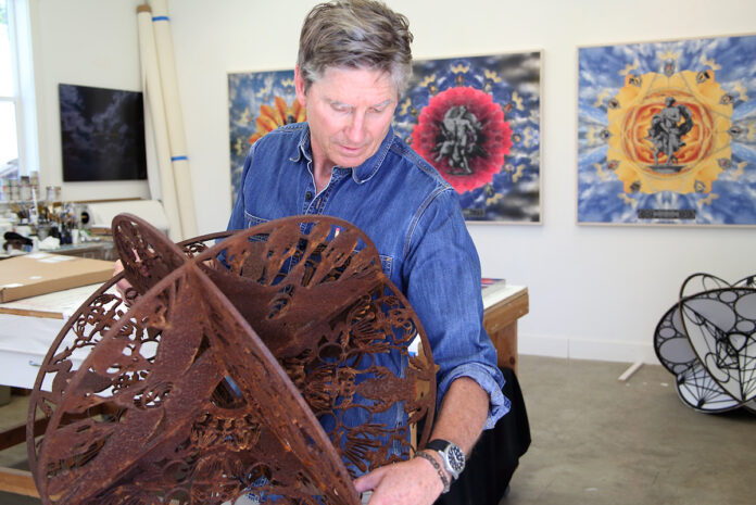 Images of his striking bronze sculptures—which sat in the Sonoma Plaza as part of a collaborative installation between the Sonoma Valley Museum of Art and The City of Sonoma in 2021—may come to mind. For those who don’t know him or his work, Hassen is a multimedia artist, whose art localizes themes of science, nature and spirituality. From large-scale sculpture to painting to video to printmaking, Hassen’s work is an invitation to consider the human relationship with, well, everything else.