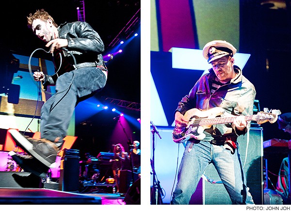 I’m not sure if there’s a fancy plural form for “legend”, but there should be, just to accurately describe Gorillaz’s Escape to Plastic Beach Tour, which dazzled Oakland on Saturday. While not filled to capacity, the costumed crowd was enthralled from start to finish not only by Jamie Hewlett’s inventive animation (projected on a giant screen behind the performers) , but also musical pioneers as diverse as Bobby Womack, De La Soul and The Clash’s Mick Jones and Paul Simonon (whose sailor outfits inspired clones throughout the arena). The spectacle’s ringleader, of course, was Gorillaz mastermind Damon Albarn, who engaged the crown nonstop, seemingly relishing the stateside arena-size audience that his Blur could never draw.