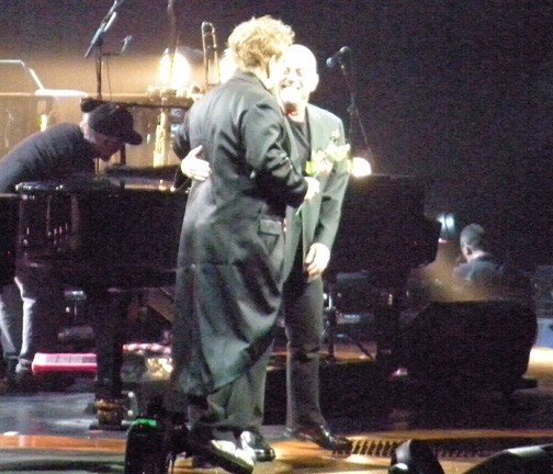 Starting a little after 7:30 and wrapping at 11pm, the marathon run was a nonstop extravaganza of HITS, HITS, HITS. From opening classic “Your Song” through “My Life” and “Rocket Man”– which led the mostly middle-aged crowd excitedly rushing the stage – it was difficult to find a good bathroom break (even the album cuts were from their most celebrated albums). Joel & John traded couplets back and forth in a seamless survey of Billboard hits of the ’70s and ’80s. Nearly EVERY song of the night was instantly familiar from decades of radio and video play, and the sellout crowd gleefully sang along all night.