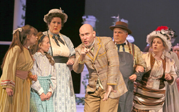 Con man “Professor” Harold Hill (Benjamin Ball) barely escapes a train full of angry traveling salespersons whose reputations he has sullied with a variety of scams and swindles. He finds himself in River City, where the residents are ripe for the picking with his latest confidence game of forming a town band.