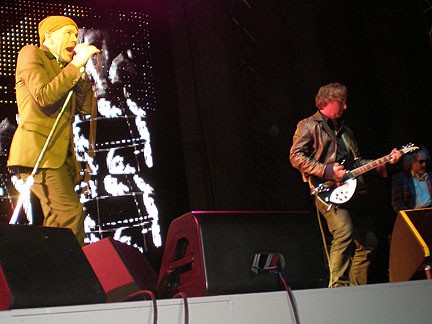And the slow songs pretty much ended there, which more than anything harkened back to their glorious I.R.S. days. I’ve been seeing R.E.M. since 1995 and never before have seen bassist/pianist Mike Mills stand up for such extended periods. But the ubiquitous “throwback” comments about this period are misleading, since Accelerate doesn’t really sound like any of their other records. R.E.M. in 2008 is derivative of their hey day chiefly in terms of spirit and onstage abandon. While Saturday showed each member of the band more sprightly than in recent years – even perennially chill guitarist Peter Buck – the stage leaps and running around were kept to a minimum, perfectly dignified for 50-somethings.