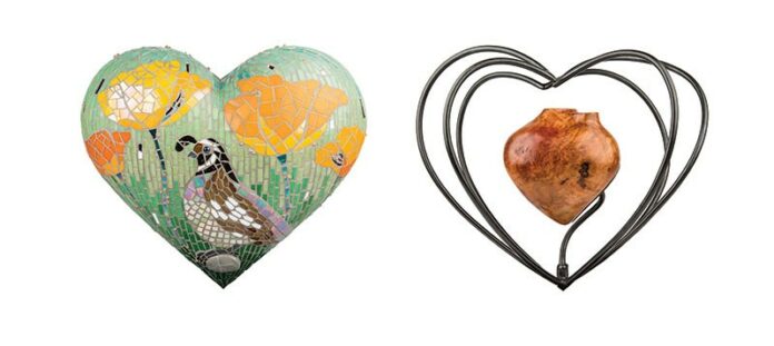 Duckett’s table-top-sized heart sculpture (shown, at left), titled I<3 California, is decorated in her signature mosaic style. Its depiction of a quail running through poppies was inspired by a childhood memory.