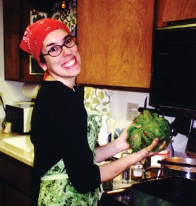 Still Life With Green Meat: The author, captured here in one of two separate photos, each taken on two separate occasions, when she had enigmatically smeared perfectly good roasts with green stuff.