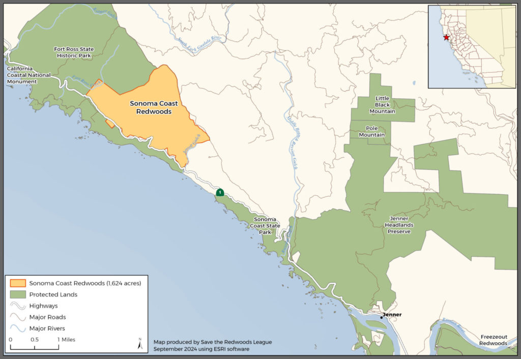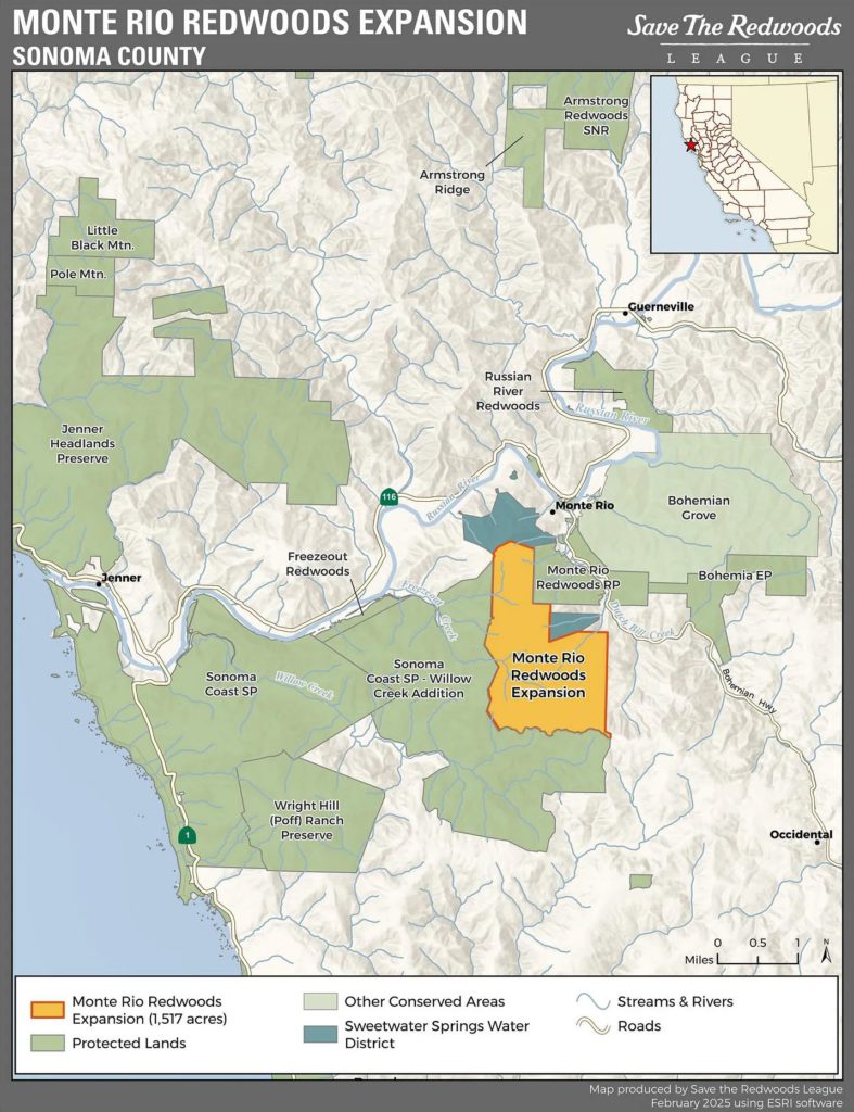 Parcels that make up the property will be purchased from the Mendocino Redwood Company for $24 million, the league announced in a press release [on Feb. 11]. The purchased land is set to connect Monte Rio Redwoods Regional Park to the east and Sonoma Coast State Park to the west, adding to an existing swath of protected land that blankets much of the Russian River Valley and a large stretch of coastline.