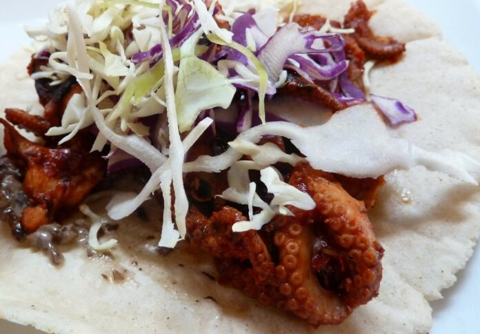 I’m a fan of octopus paired with the sweet, smoky bite of guajillo chiles, but when the duo turns up in a taco ($8.50), the octopus lacks its characteristic meatiness. Better are the battered shrimp tacos ($8.50), a bit oily but good rolled up with a cucumber and cilantro aioli and shredded cabbage.