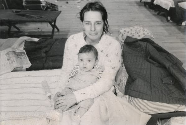 This is the photo that started it all, and inspired us to begin this project. Sitting on a mattress at the Santa Rosa Vets Building, with a newspaper, a bottle and some cots nearby, is a new mother holding her baby. Displaced from her Guerneville home by the flood and awaiting whatever future may come, the young mom looks undeterred; the baby, oblivious.This woman’s name is Candy Turner, and we’ve tried to Google it—to no avail. She would be almost 50 by now, we’re guessing. The baby would be 26 or 27. Does anyone remember Candy Turner? And where is that wide-eyed baby now?Let us know in the comments below.The Guerneville Flood Project is a week-long dive into the photo archives of the North Bay Bohemian. Read about the project here, and view more 1986 Guerneville Flood photos by clicking here.