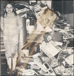 This girl looks all to happy to be standing next to a gigantic pile of destroyed, water-logged textbooks!All we know is that this photo was taken at Monte Rio School by Carl Van Dyke.