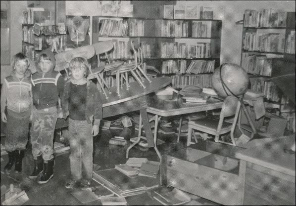 Schools were definitely closed during the flood—and in the immediate aftermath. These kids survey the wreckage of their classroom at Monte Rio School. Note how the chairs are still placed atop the table for the janitors to sweep up at the end of the day. Turns out the floors got a giant mopping instead.